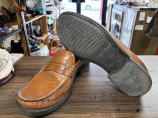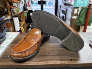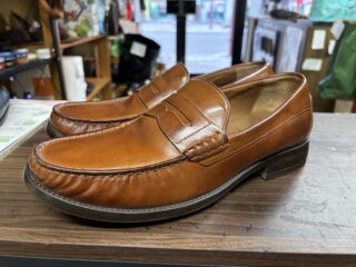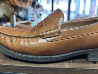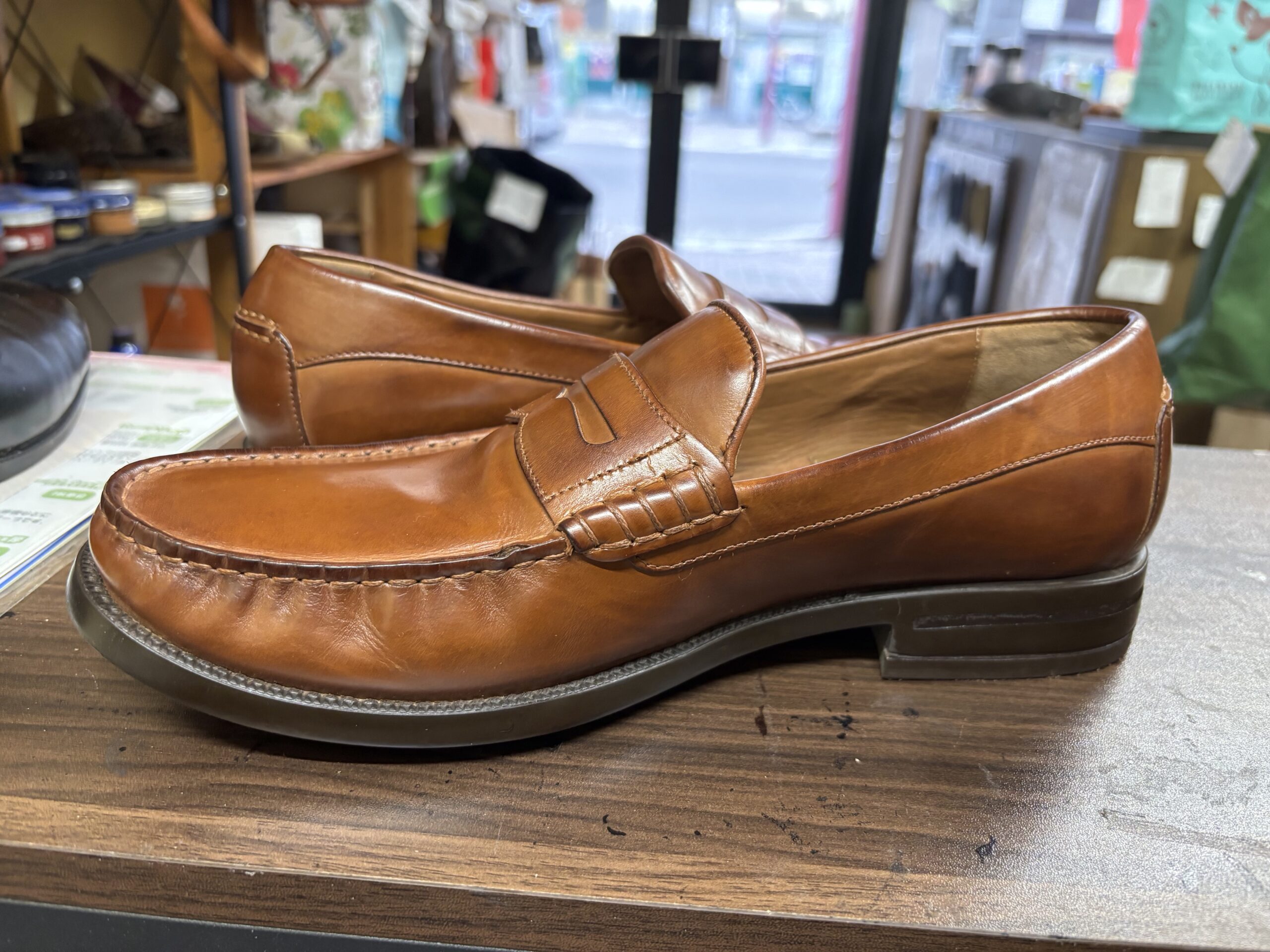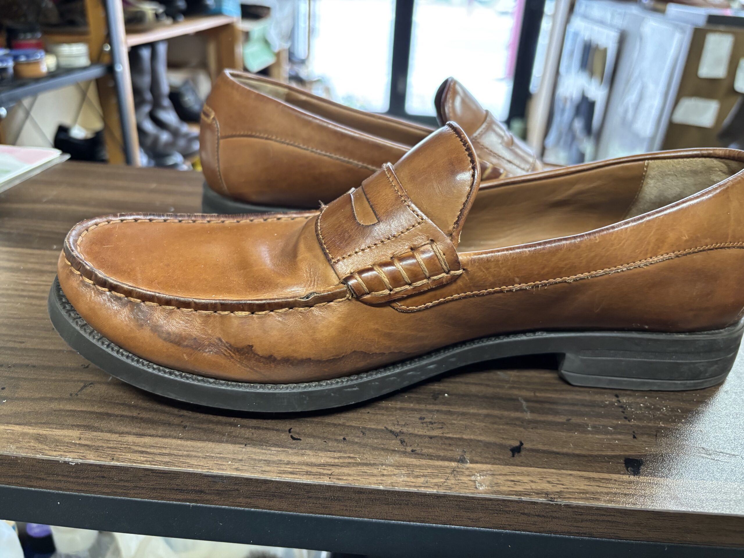 ジョンストン&マーフィーのローファーの横にくっきりと水シミ。原因は色々で、飲み物をこぼしたのか、もともと革の油分、塩分が溶けて起こるのか?落ちない事もあるので、一度ご相談に来て下さい。